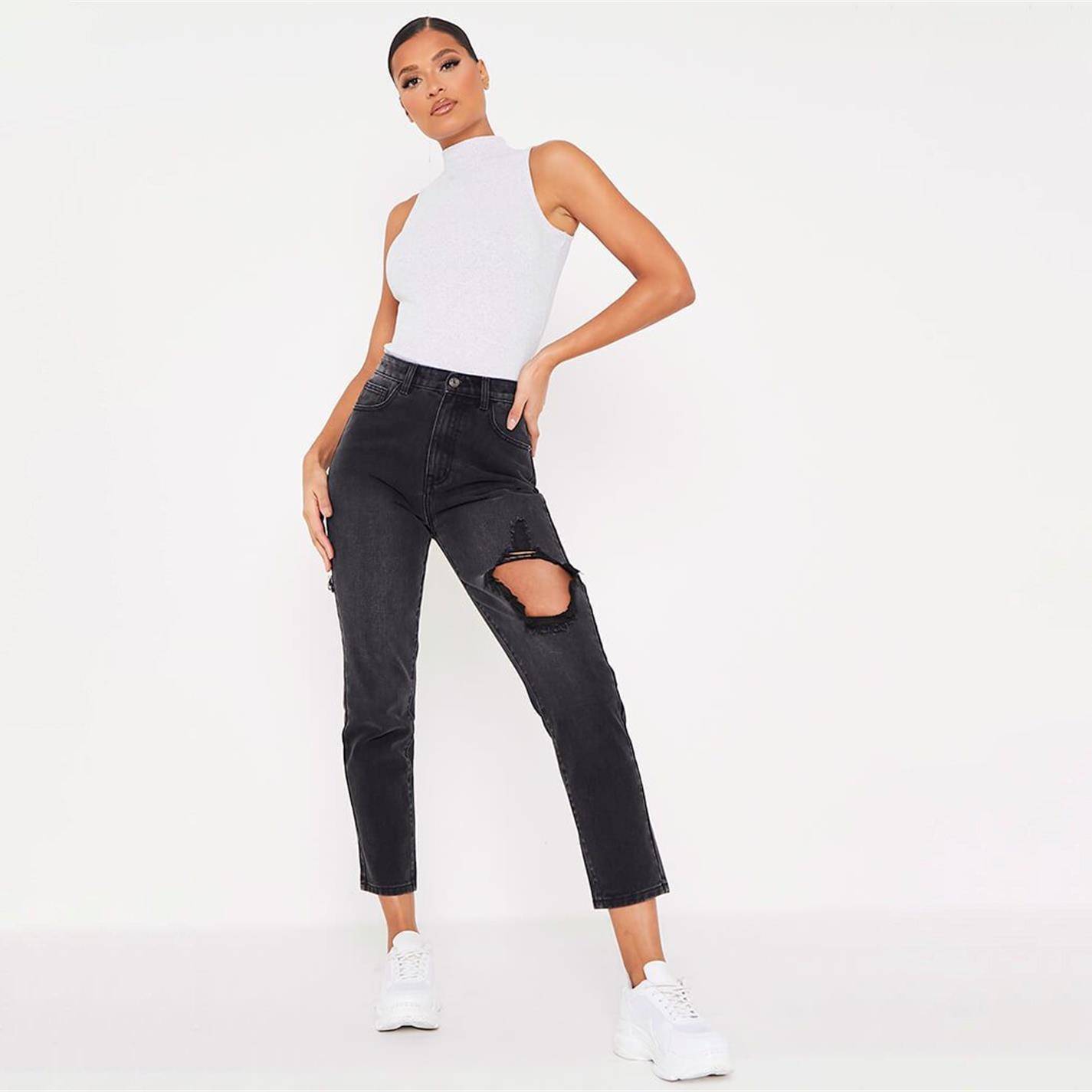 Denim jeans in een mom fit met hoge taille en gescheurde details aan de voor- en achterkant.