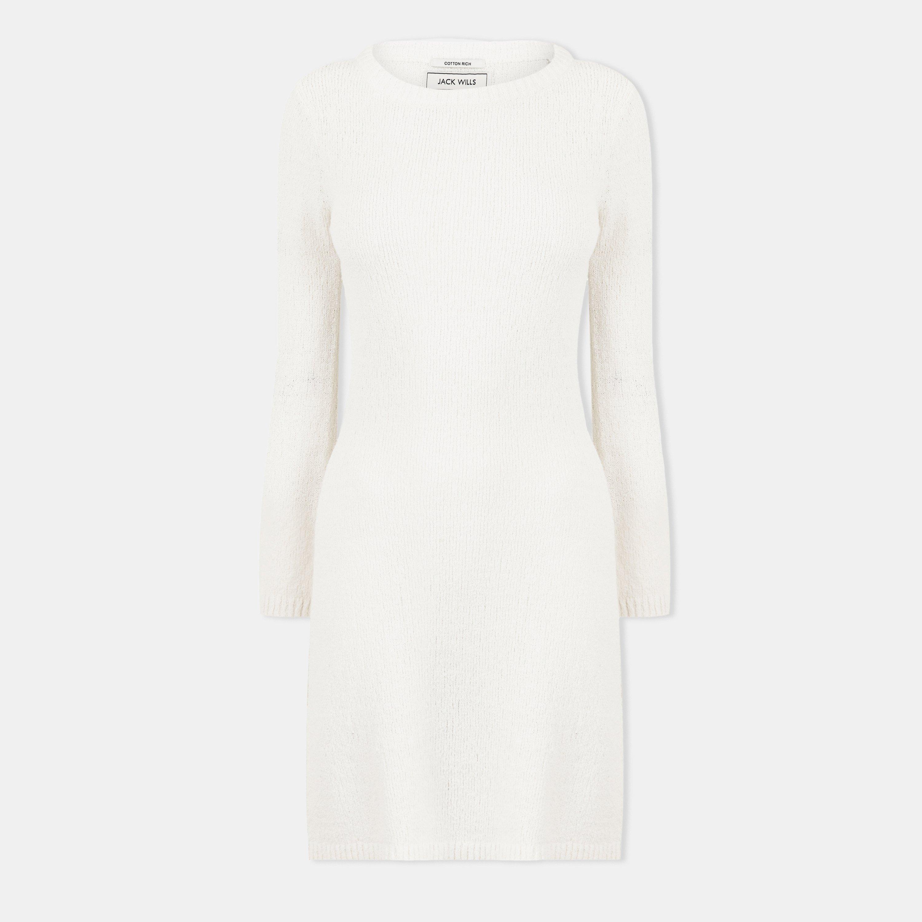 De Gebreide Mini Jurk met Belmouwen van Jack Wills combineert een elegante vorm met textuurinteresse. De opvallende belmouwen creëren dramatisch volume tegen het aansluitende mini-profiel, wat hedendaagse vrouwelijkheid met klassieke Britse stijl levert.