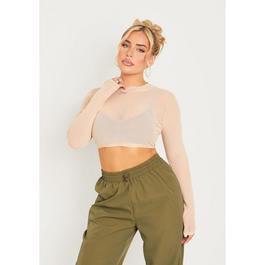 Missy Empire Mesh Contrast Seam Lace Up Long Sleeve Crop Top