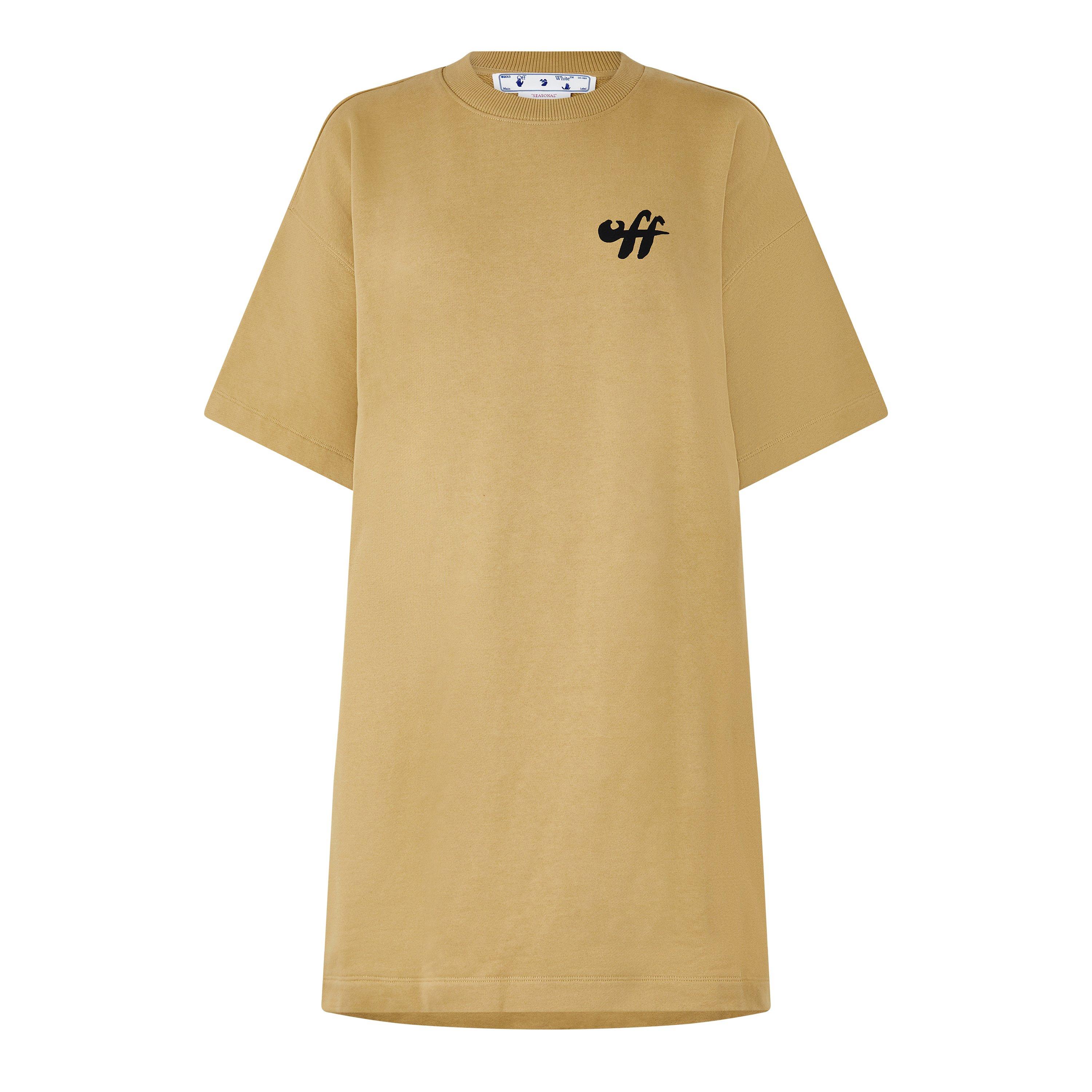De Zebra Pijlen T-Shirt Jurk van Off-White wordt gekenmerkt door de knielange vorm met korte mouwen. Deze t-shirtstijl jurk fungeert als een top, waarbij minimalistisch ontwerp wordt gecombineerd met zebra-print merk elementen voor dagelijkse styling.