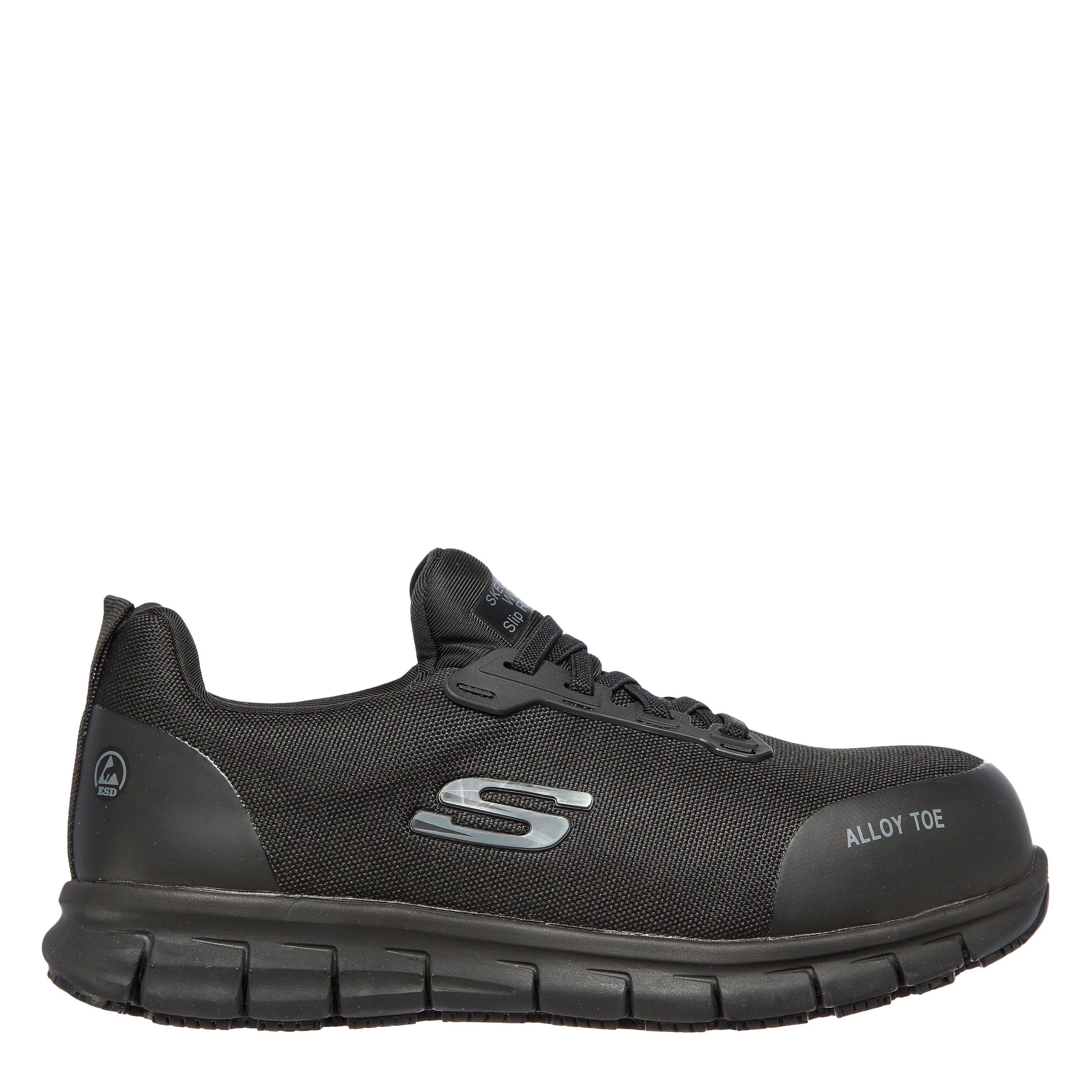 Ga comfortabel en veilig de dag door met Skechers Work™: Sure Track - Jixie. Dit slipvaste werkontwerp heeft een bovenwerk van mesh en synthetisch materiaal met een beschermende neus van legering en rekbare veters.