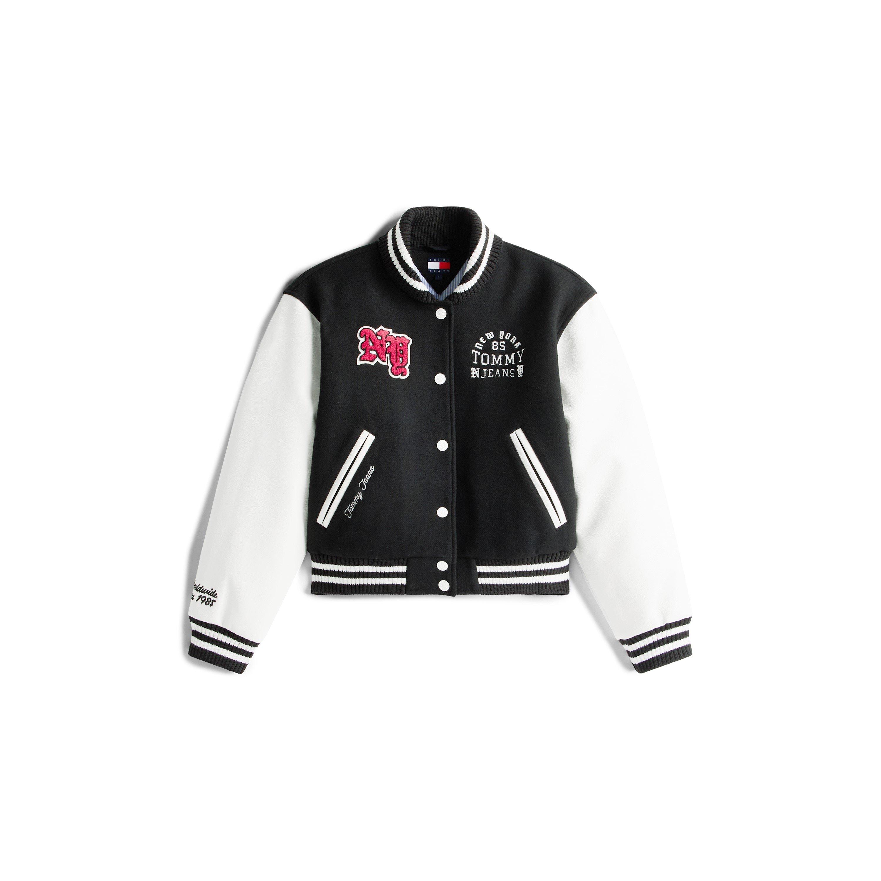 De Tommy Jeans Women's Contrast Trim Varsity Jacket biedt een collegiale erfgoed met moderne aantrekkingskracht. Deze gestructureerde jas heeft precisie-gesneden panelen met contrastafwerking die de authentieke varsity-look versterkt, terwijl de Tommy-branding elementen het een herkenbaar stuk maken.